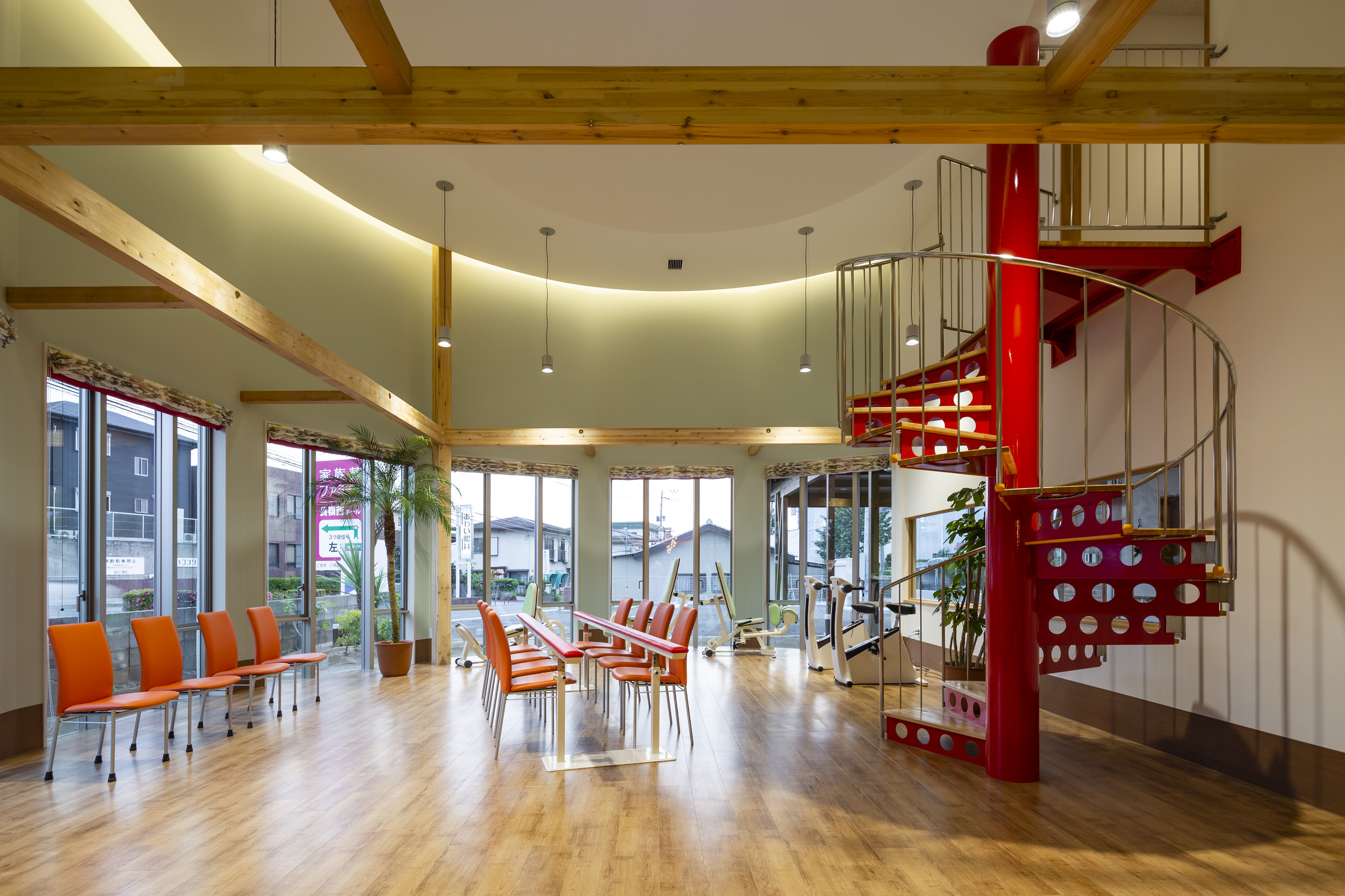 当施設は、道路沿いに面したお洒落な外観が目を引く、定員80名の大規模なデイサービス施設です。